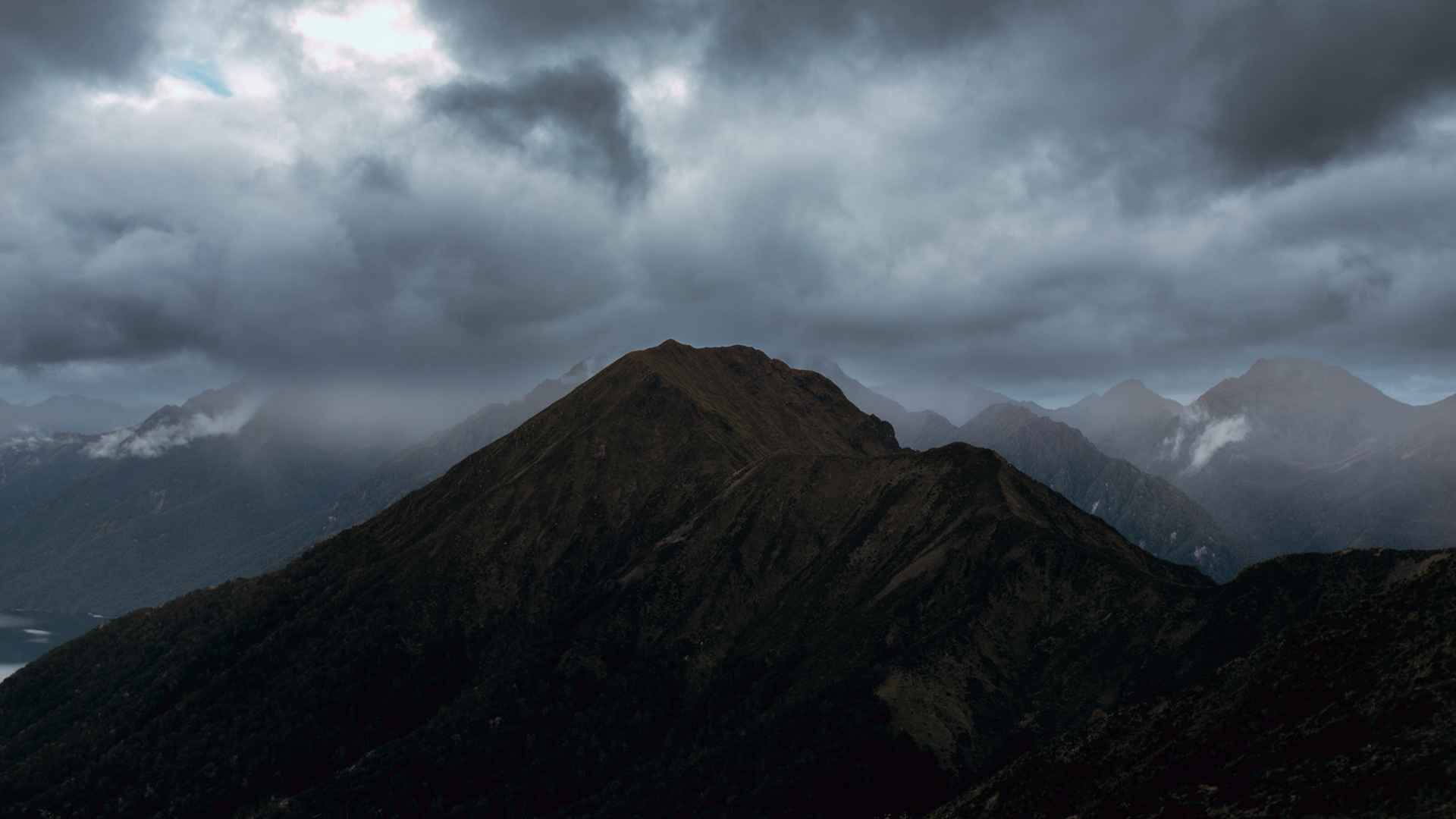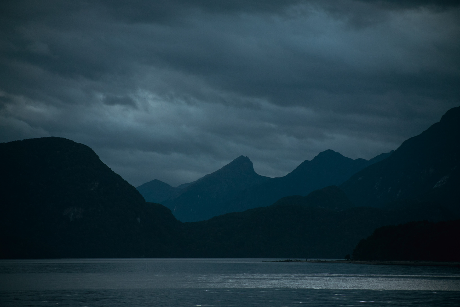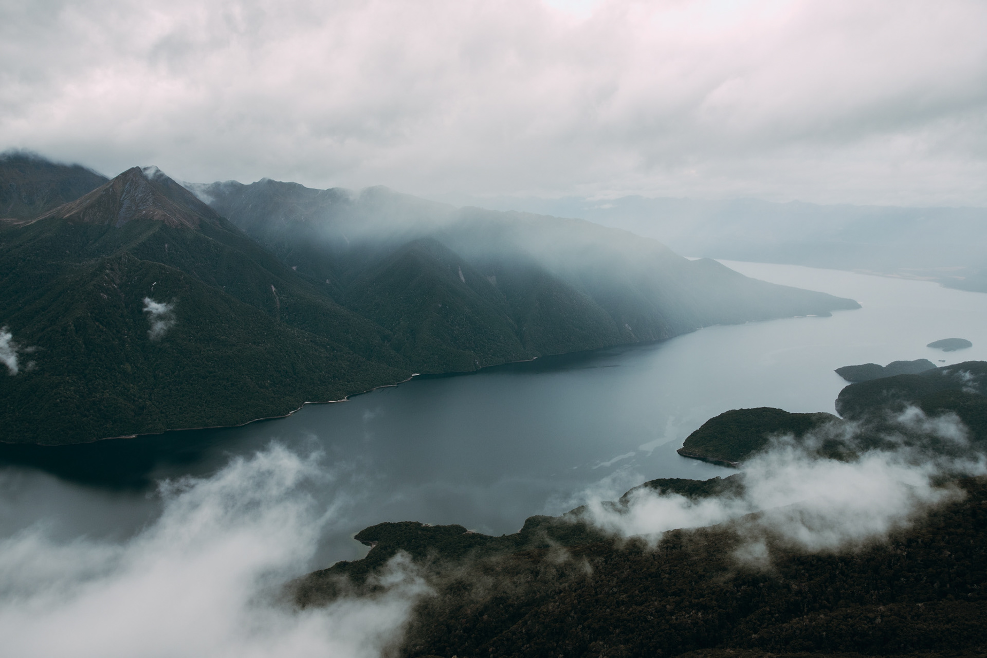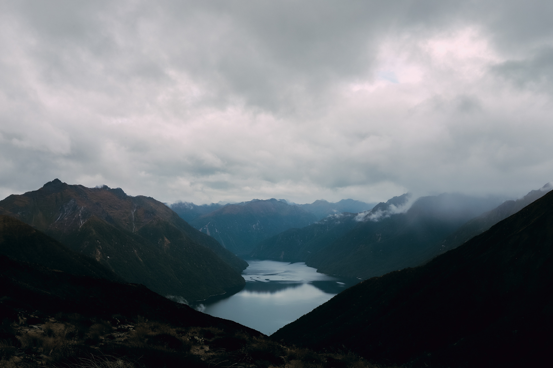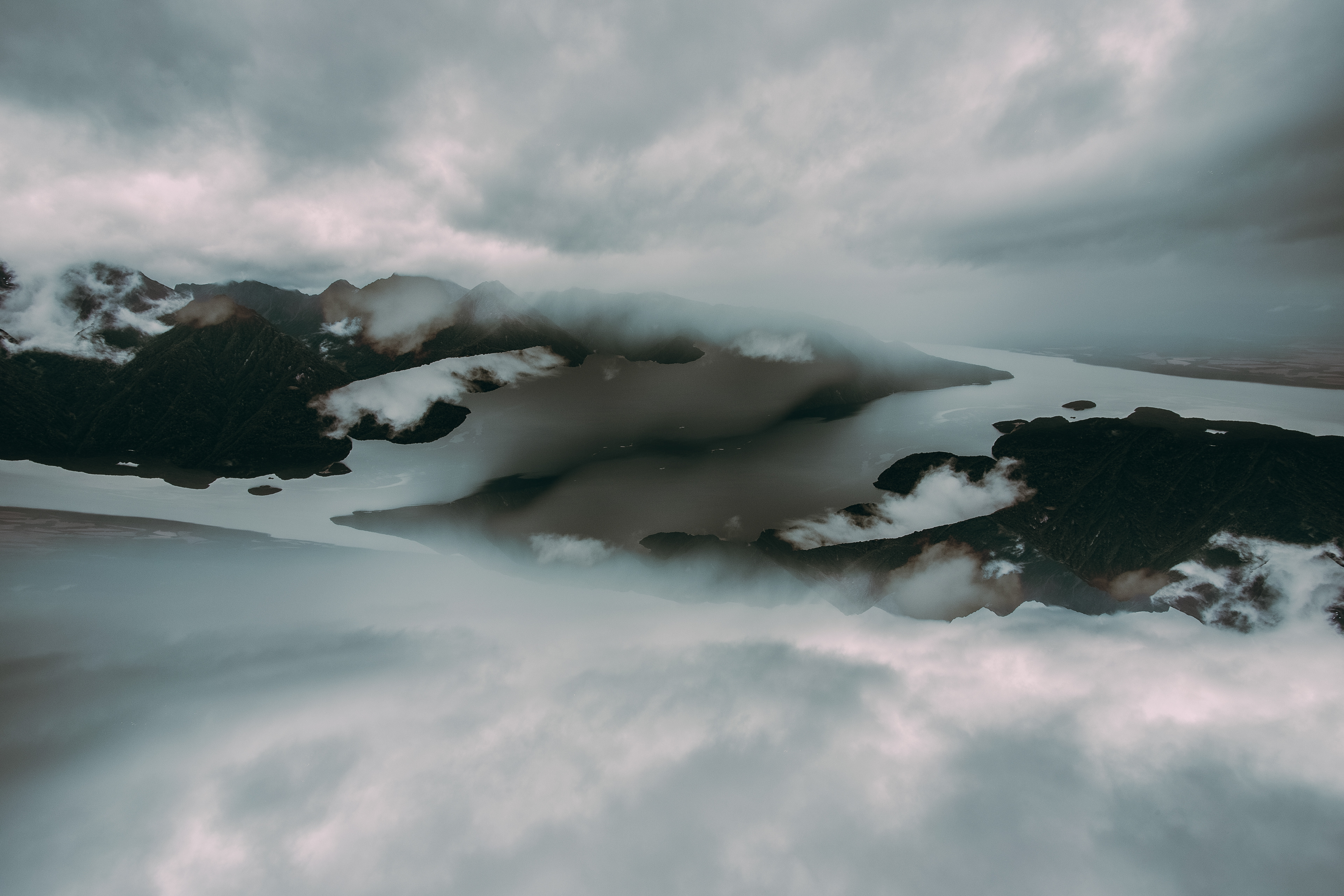 Low clouds began to drift and reveal the rugged contours of the mountain range surrounding Lake Te Anau. Shot from a high vantage point to emphasize the sweeping scale of the landscape - then mirrored composition in post to enhance the natural symmetry between the cloud forms and ridgelines.