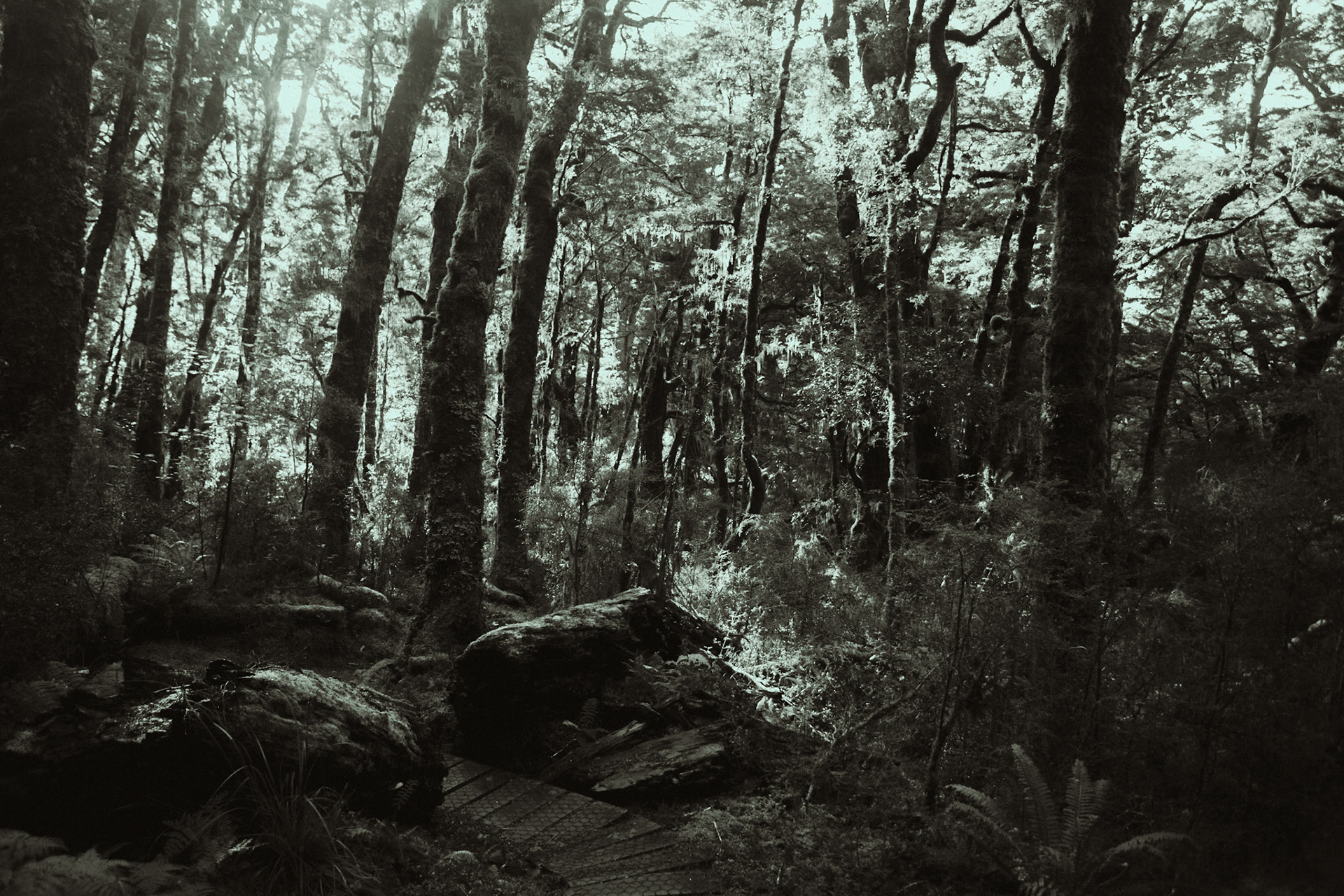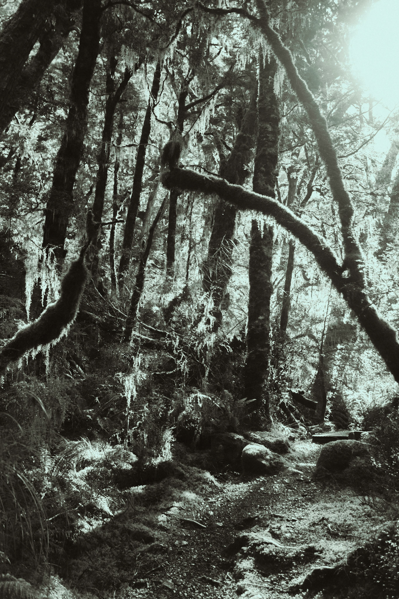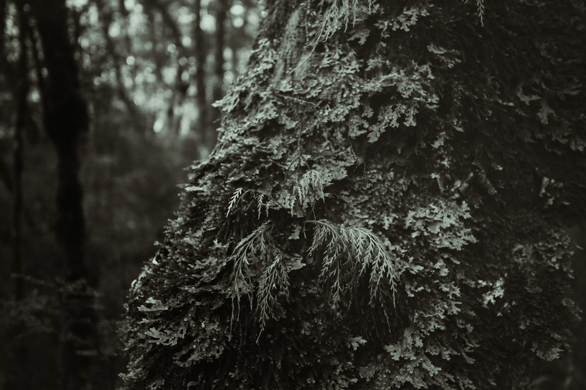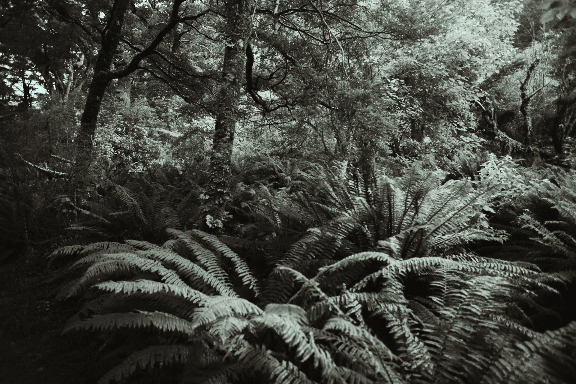I metered for the shadows to preserve detail in the darker foliage, allowing the highlights to fall off slightly for a more dramatic contrast. The monochrome film emphasized the intricate structure of the fern leaves and the bark’s texture without the distraction of color.